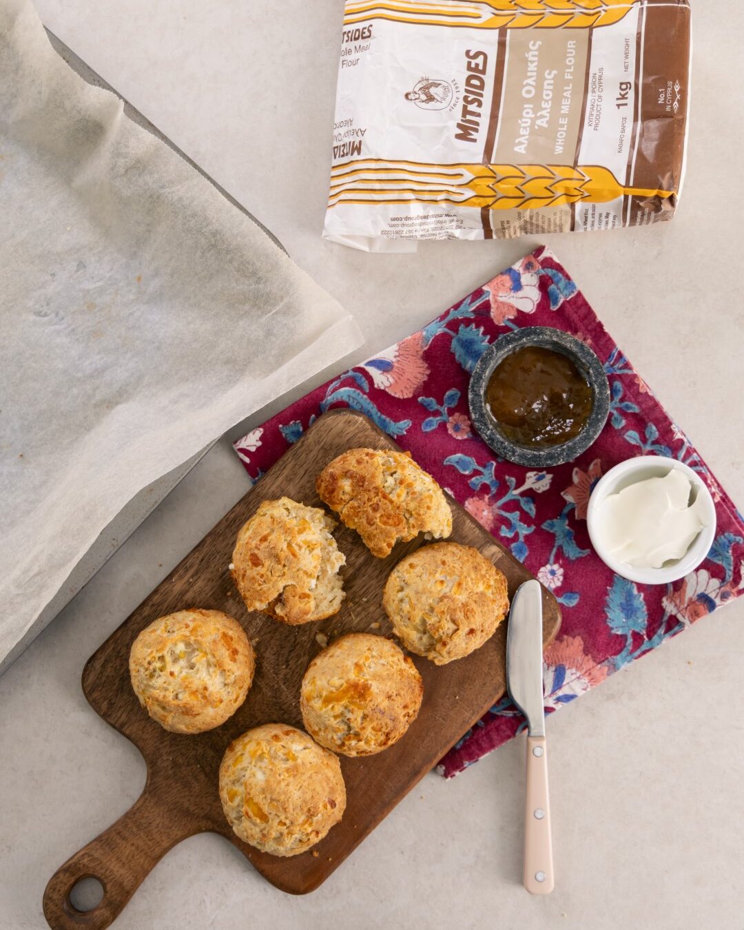 Προθερμάνετε τον φούρνο στους 180°C. Σε ένα μπολ ανακατέψτε το αυγό, το τυρί τσένταρ, τη φέτα, το γιαούρτι και το ελαιόλαδο. Προσθέστε το αλεύρι και το μπέικιν πάουντερ και ανακατέψτε καλά. Με λαδωμένα χέρια, σχηματίστε 6 μπαλάκια ζύμης και τοποθετήστε τα σε ένα ταψί στρωμένο με λαδόκολλα. Ψήστε για 15-20 λεπτά. Απολαύστε τα όσο είναι ακόμα ζεστά. Σαν ιδέα σερβιρίσματος, αν σας αρέσει να τα κόβετε στη μέση και προσθέτετε λίγο τυρί κρέμα και μαρμελάδα βερίκοκο!